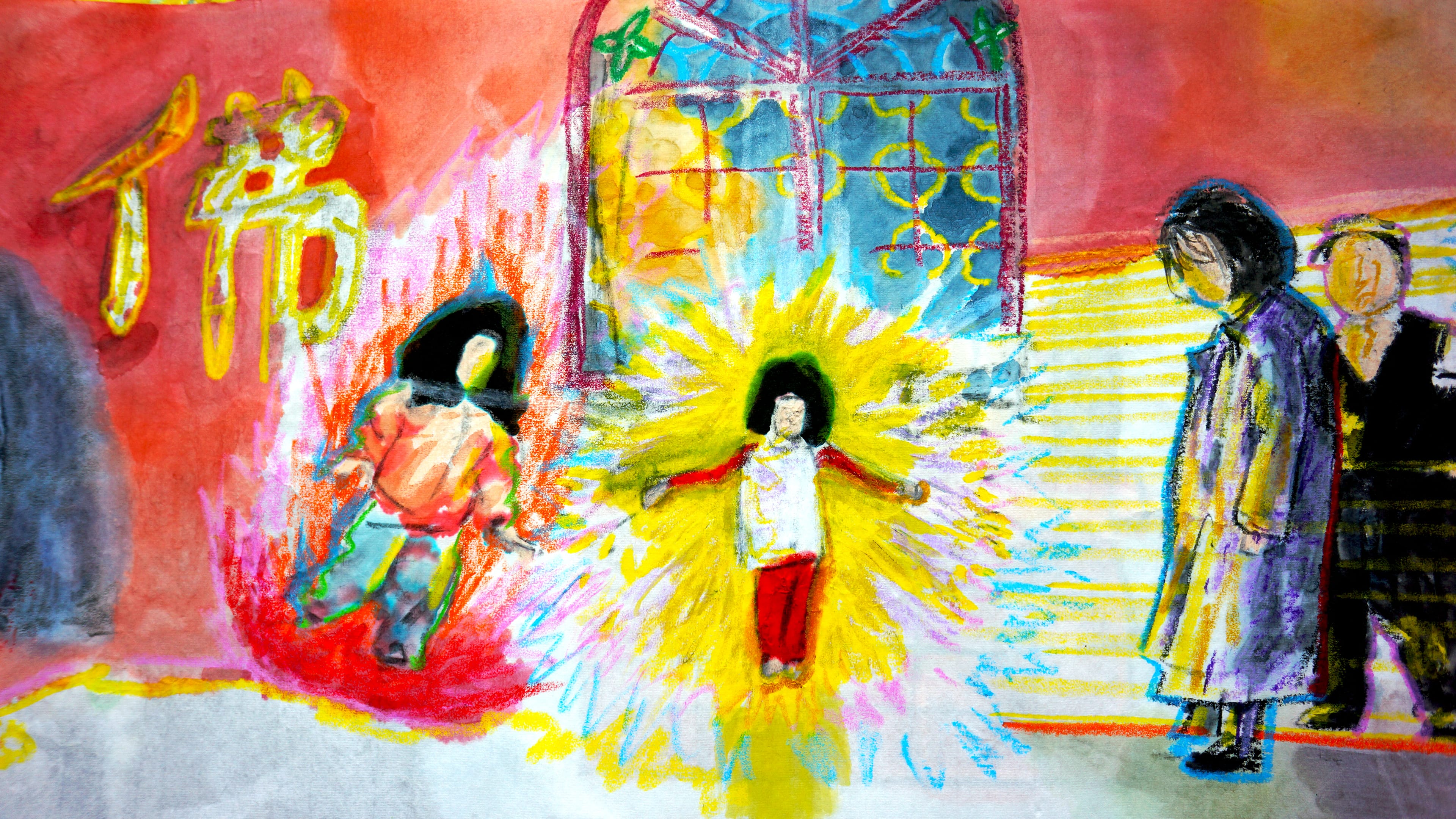 Charcoal and pigment on raw xuan paper, 135 × 35 cm. A folk-coloured rendering of the Four Heavenly Kings flanking a central red shrine in which a small golden Buddha sits. Guardians in warrior dress at the sides; the centre held quiet.