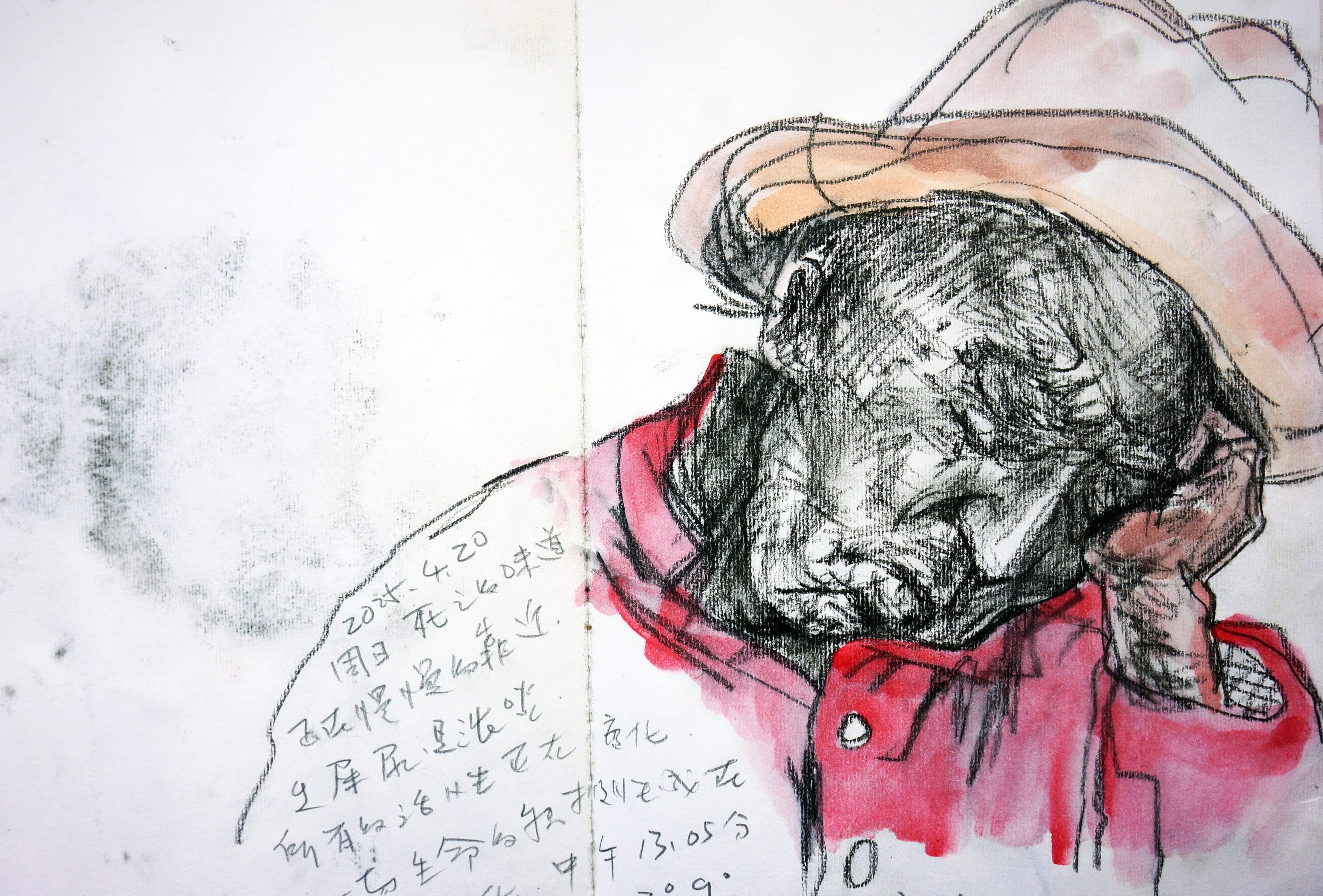For six months, the artist stopped all creative work and devoted himself entirely to caring for his dying father. At the same time, he recorded daily life in charcoal: the state of his father regressing to a three-year-old child — the details of feeding, changing diapers, assisting with bodily functions — alongside the process of building a kitchen, a bedroom, and a garden for his father with his own hands.